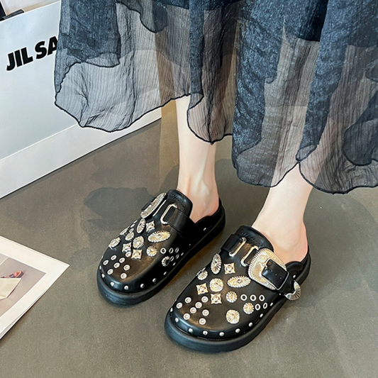 OCW Women Sandals Platform Rivets Punk Rock Leather Mules Metal Fittings Slipper