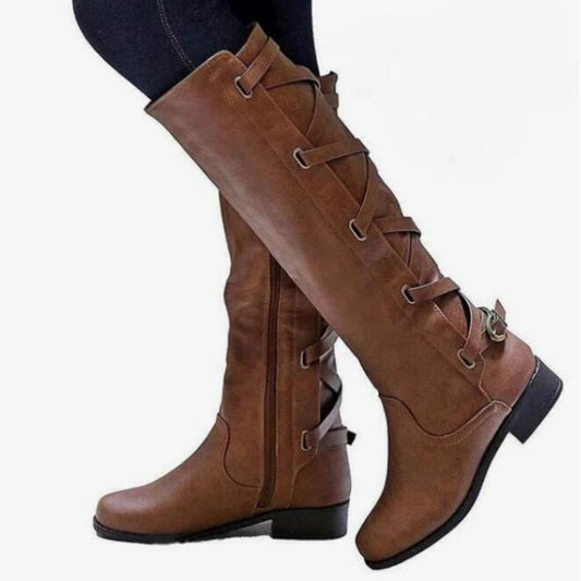 OCW Women Winter New Knee High Boots Waterproof Leather Made Unique Strap Shoes Design