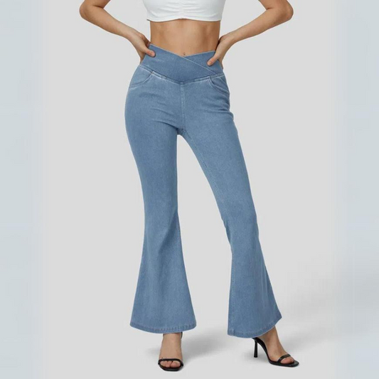 OCW High Waisted Flared Jean Crossover Pocket Washed Stretchy Casual Super Flared