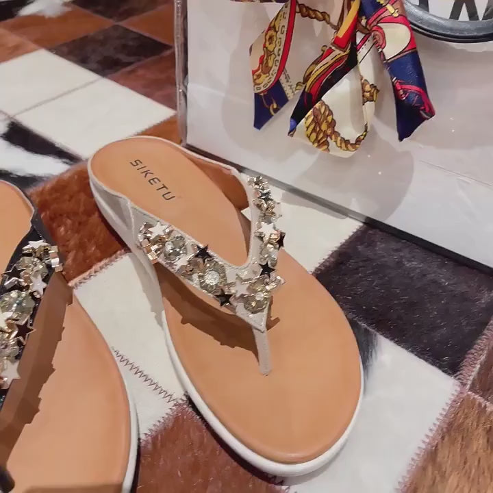 3D shiny details including round and star-shaped beads cover the sandal strap fully, capturing all attention for their sparkling visual without exerting extra weight on your feet.