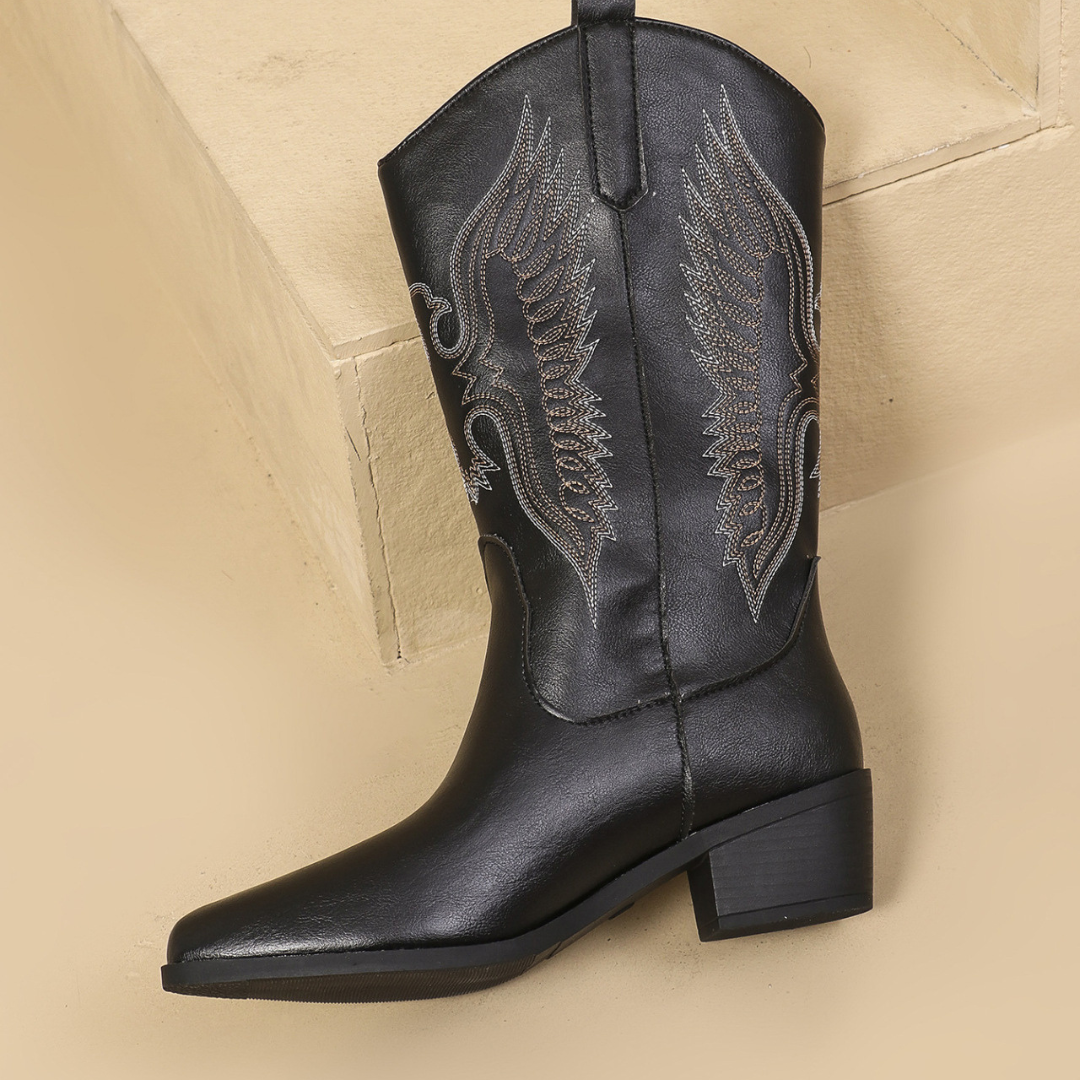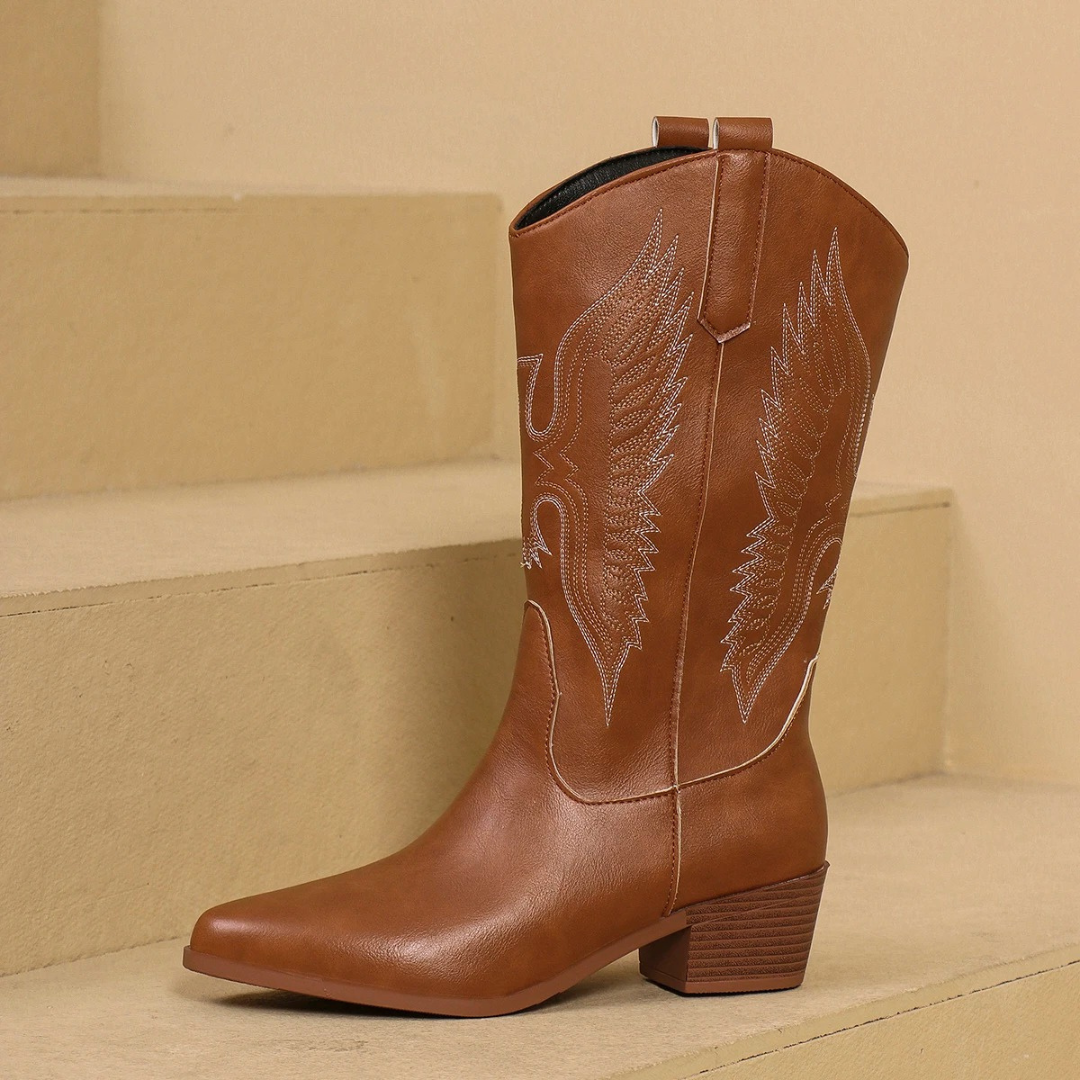 OCW Women Winter Boots Embroidered Stitching Leather Snip Toe Slip On Mid Calf Cowboy Boots