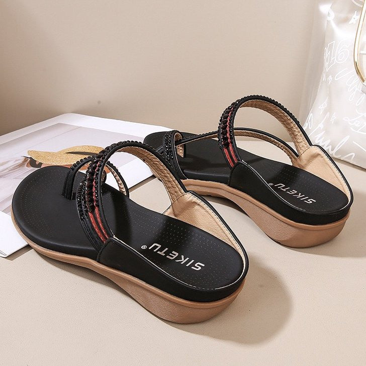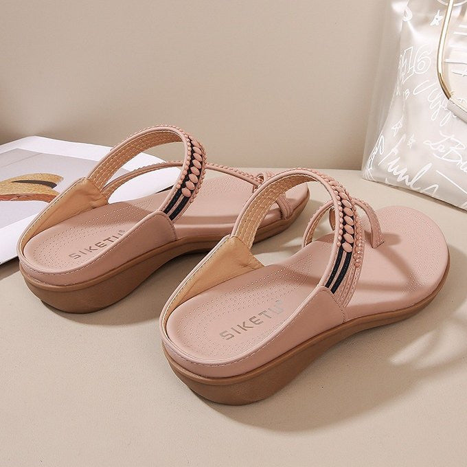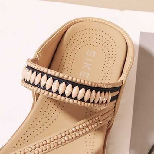 Shiny beads attached to sandal thongs are the highlight of this design, distinguishing these sandals as one-of-a-kind summer footwear for fashionable ladies.