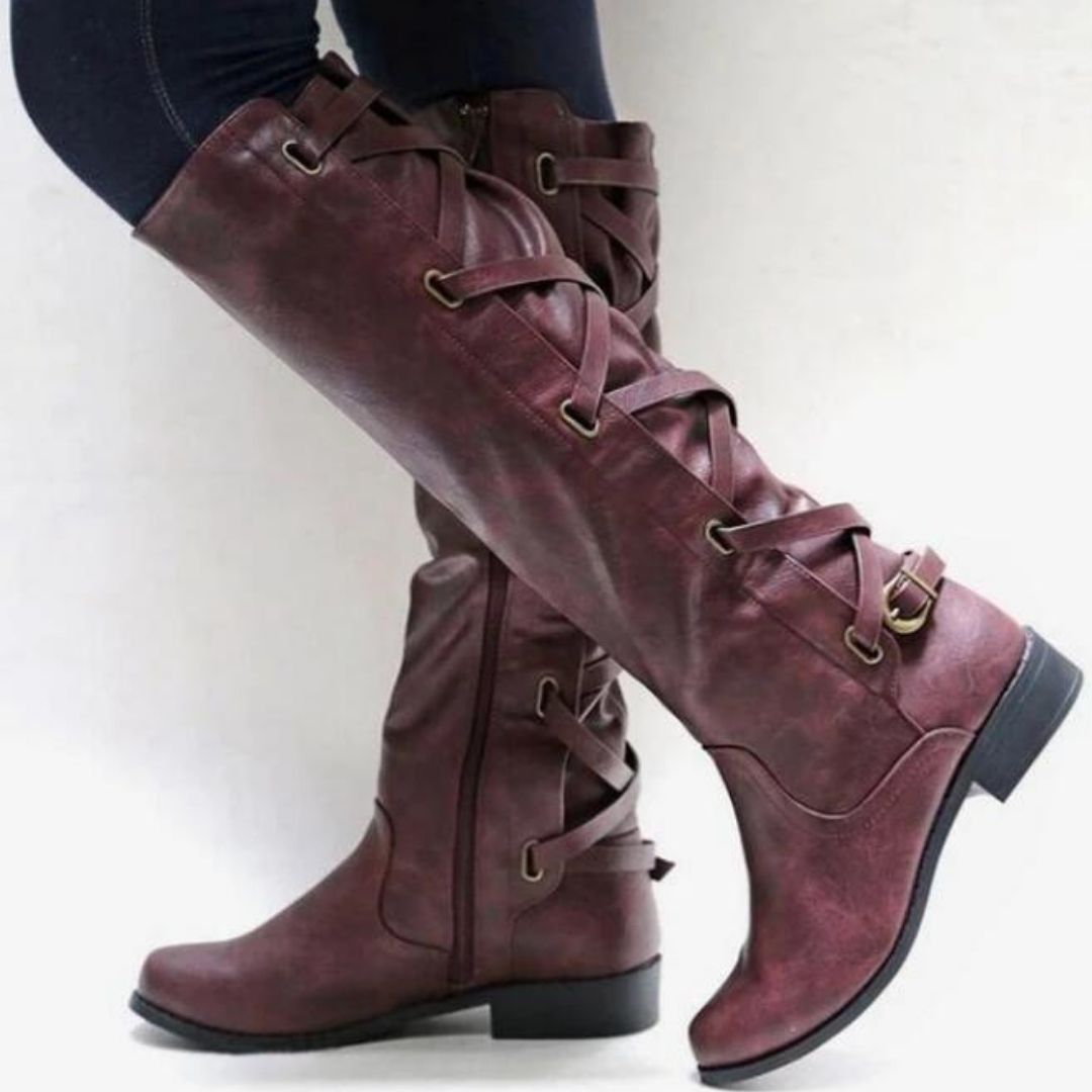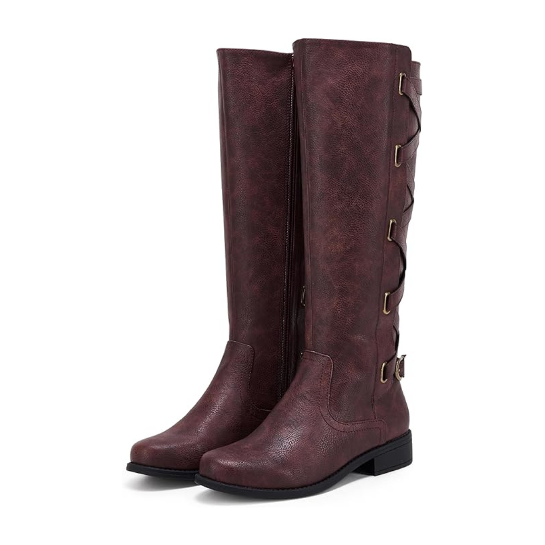 OCW Women Winter New Knee High Boots Waterproof Leather Made Unique Strap Shoes Design